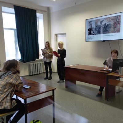 6 и 8 февраля студентки 1 курса Полозова Софья, Колюкаева Екатерина, Ширипова Анастасия провели с однокурсниками презентацию «Война. Народ. Победа», к 80-летию со дня освобождения города Воронежа от немецко-фашистских захватчиков. В ходе мероприятия так же была представлена презентация «А. А. Бучкури, трагическая гибель...».