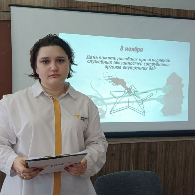 Советник директора по воспитанию Бондарева М.В. провела со студентами 1 курса мероприятие, посвященное памятному дню. Маргарита Валентиновна рассказала о подвигах сотрудников органов внутренних дел. Присутствующие почтили минутой молчания память героев, погибших при исполнении служебных обязанностей.