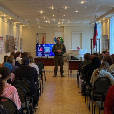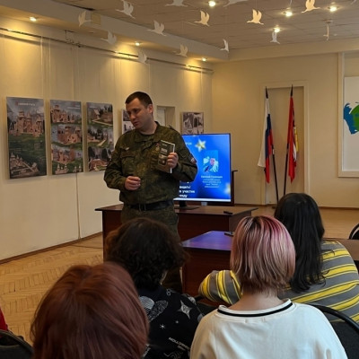 Перед студентами и преподавателями выступил участник специальной военной операции, артиллерист-наводчик, а ныне писатель Евгений Владимирович Голенцов.