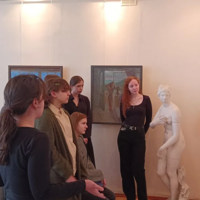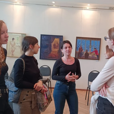 Преподаватель, член- корреспондент РАХ Токарева Ирина Евгеньевна провела экскурсию по выставке, вдохновив будущих художников на выбор своего пути.