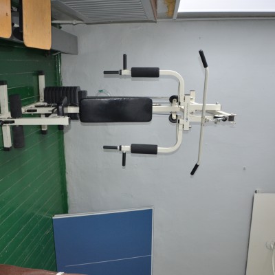 Имеется оборудование: Теннисный стол 1шт., Ракетки 2компл., Мяч волейбольный 5шт, Ракетки бадминтон 2компл., Скакалки 5шт, Тренажер силовой 1шт., Шведская сетка 1шт., Сетка волейбольная 1шт.